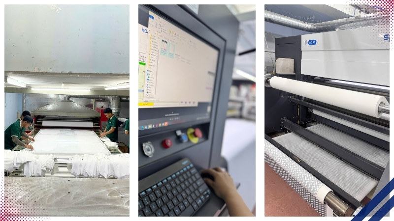 Để đạt được tiêu chuẩn công nghệ in vải lụa sắc nét bền màu, Hoa Phat Garment vận hành quy trình kiểm soát nghiêm ngặt từ khâu xử lý vải đến ép nhiệt: